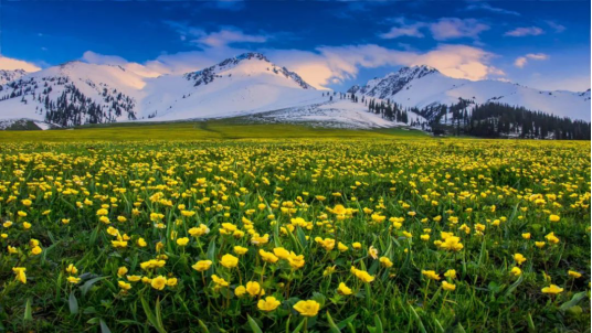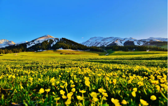 風吹草低,天地蒼茫碧綠的草原山谷,閃耀的卻是金光暖風熏染的伊犁河谷里,牛羊散落,駿馬奔忙雁群與千山暮雪來來往往雄鷹在天穹之下縱橫逍遙