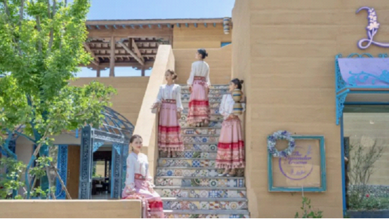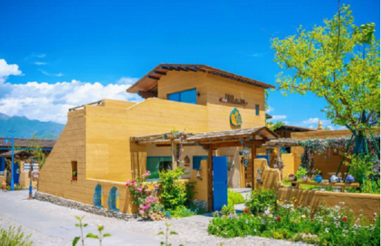 院落不僅僅是一種建筑風格,也是游客內心深處的“詩與遠方”。漫步在哈茵賽村,隨處可見一抹靚麗的藍色,宛若天空般清澈,這是當地居民喜愛的顏色。項目團隊經過吸收融合,在外墻、房頂甚至大門和窗戶大面積使用藍色、黃色等碰撞色調,將光影、植被等自然元素巧妙嵌入院落,讓人一眼驚艷、過目不忘,在回歸自然風情、還原文化風貌的同時,實現了美學時尚與民族特色的相融相生,為游客提供徐徐展開一幅和諧、寧靜的大美畫卷。
