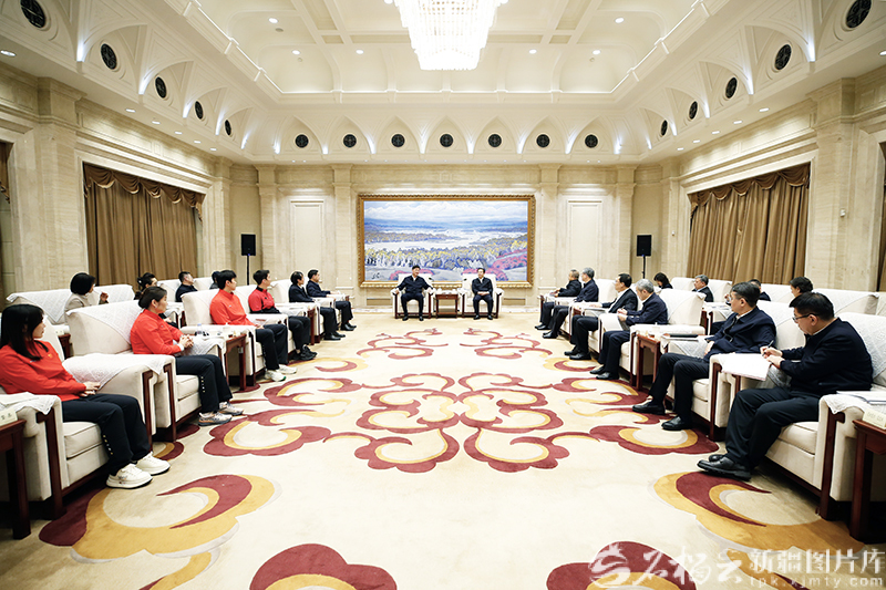 1月29日,自治區(qū)黨委書(shū)記陳小江,自治區(qū)黨委副書(shū)記、自治區(qū)主席艾爾肯·吐尼亞孜會(huì)見(jiàn)國(guó)家體育總局局長(zhǎng)、黨組書(shū)記高志丹一行。石榴云/新疆日?qǐng)?bào)記者謝龍攝