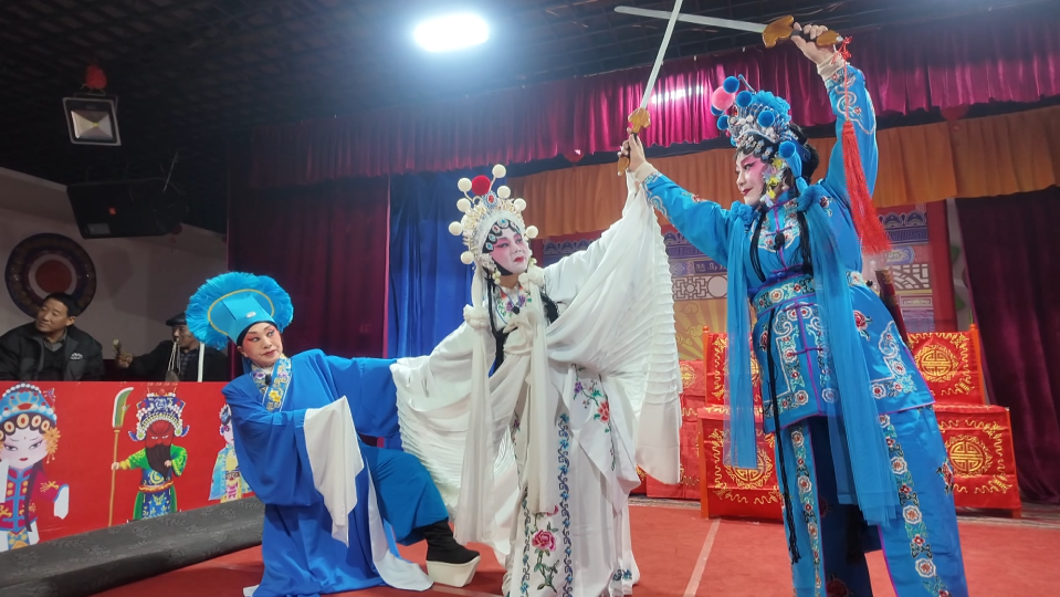舞臺(tái)之上精彩不斷,幕后籌備同樣有條不紊。沒有專業(yè)化妝團(tuán)隊(duì),演員們便相互幫忙描眉畫眼、整理行頭;簡易妝臺(tái)上,頭面、戲服等道具擺放整齊,大家分工協(xié)作、默契十足。演出間隙,演員們?nèi)宰ゾo時(shí)間打磨臺(tái)詞、雕琢身段,只為將最佳狀態(tài)呈現(xiàn)給觀眾。