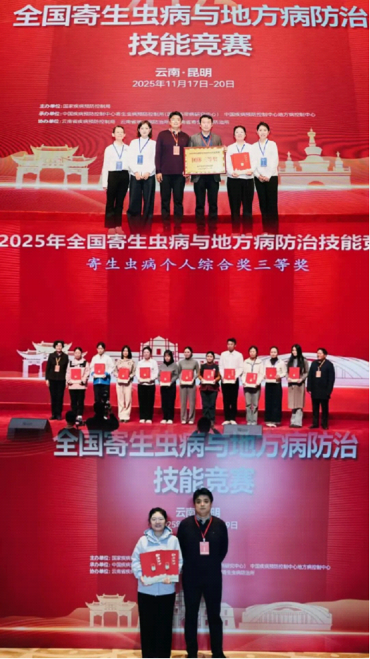 新源縣疾病預防控制中心(衛生監督所)干部賈江燕憑借深厚的專業積淀、精湛的實操技能,在全國頂尖選手中脫穎而出,一舉斬獲寄生蟲病個人技能操作三等獎與寄生蟲病個人綜合三等獎,并助力新疆維吾爾自治區參賽團隊榮膺全國寄生蟲病防治技能大賽團體三等獎,實現了新疆在全國寄生蟲病防治技能競賽中“零”的突破!
