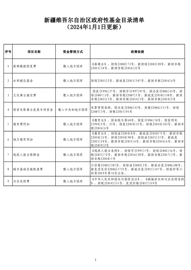 新疆維吾爾自治區政府性基金目錄清單(2024年1月1日更新)