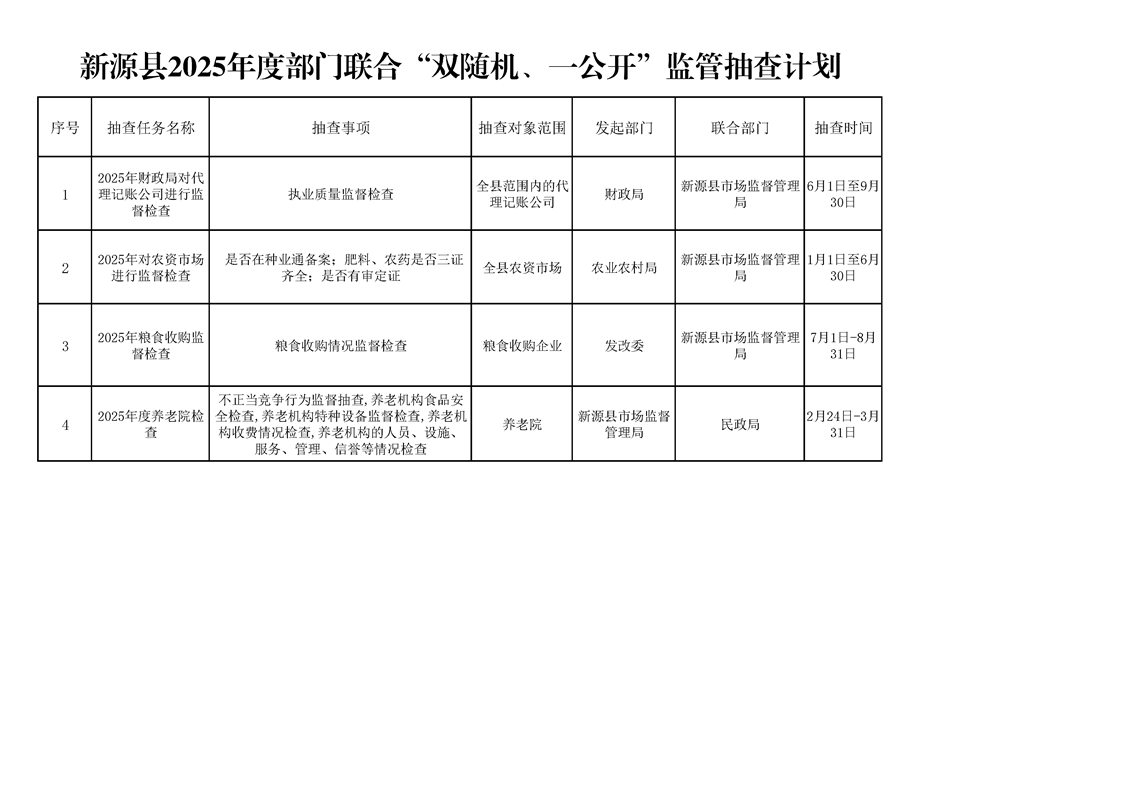 新源縣2025年度部門聯合“雙隨機、一公開”監(jiān)管抽查計劃