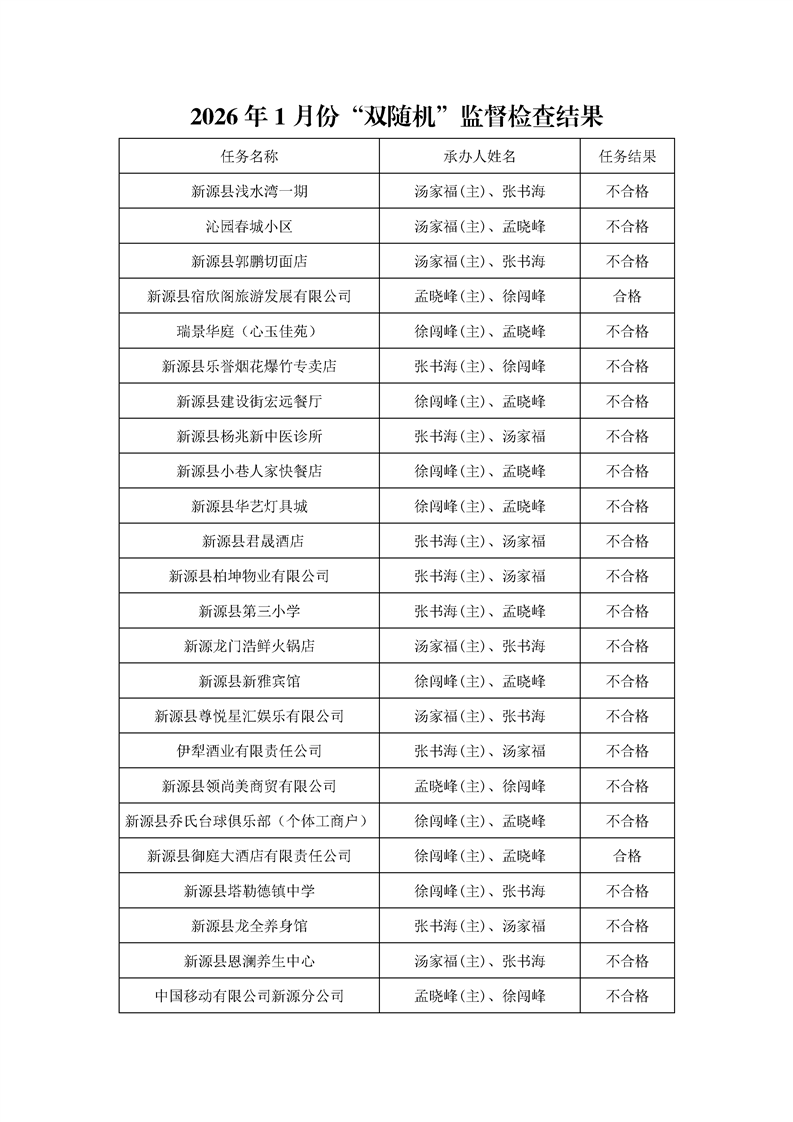 新源縣消防救援大隊2026年1月份“雙隨機”檢查結果及2月份“雙隨機”抽查計劃