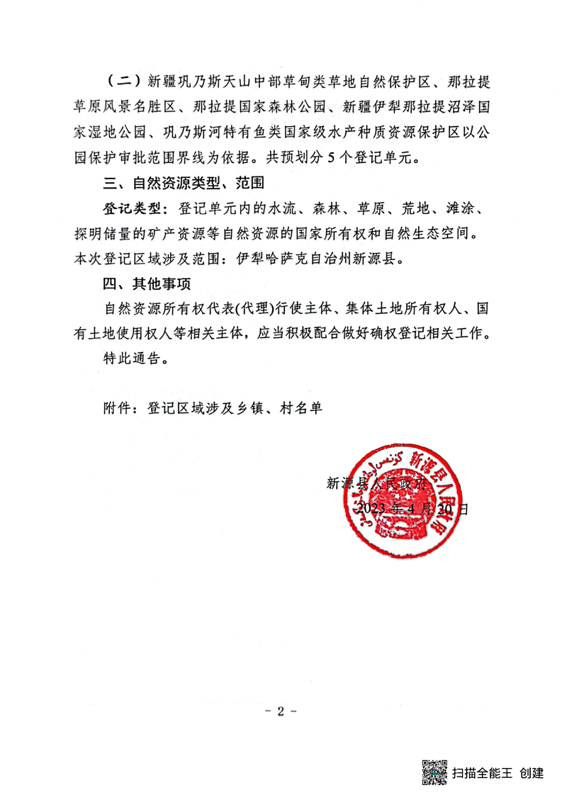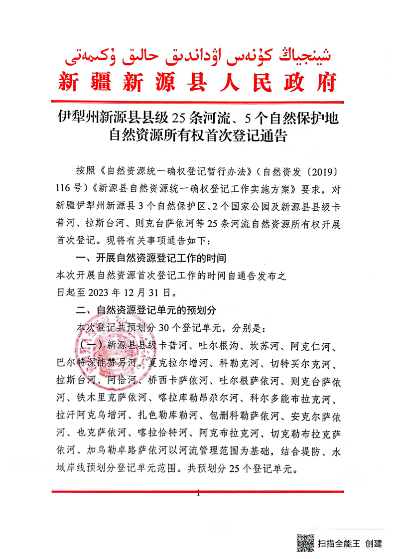 伊犁州新源縣縣級25條河流、5個自然保護地自然資源所有權(quán)首次登記通告