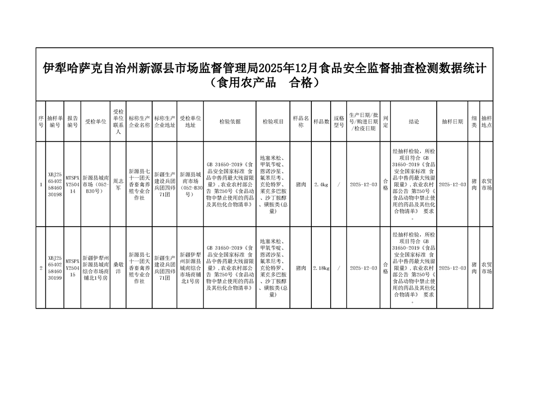 伊犁哈薩克自治州新源縣市場監(jiān)督管理局2025年12月食品安全監(jiān)督抽查檢測數(shù)據(jù)統(tǒng)計(合格 食用農(nóng)產(chǎn)品)