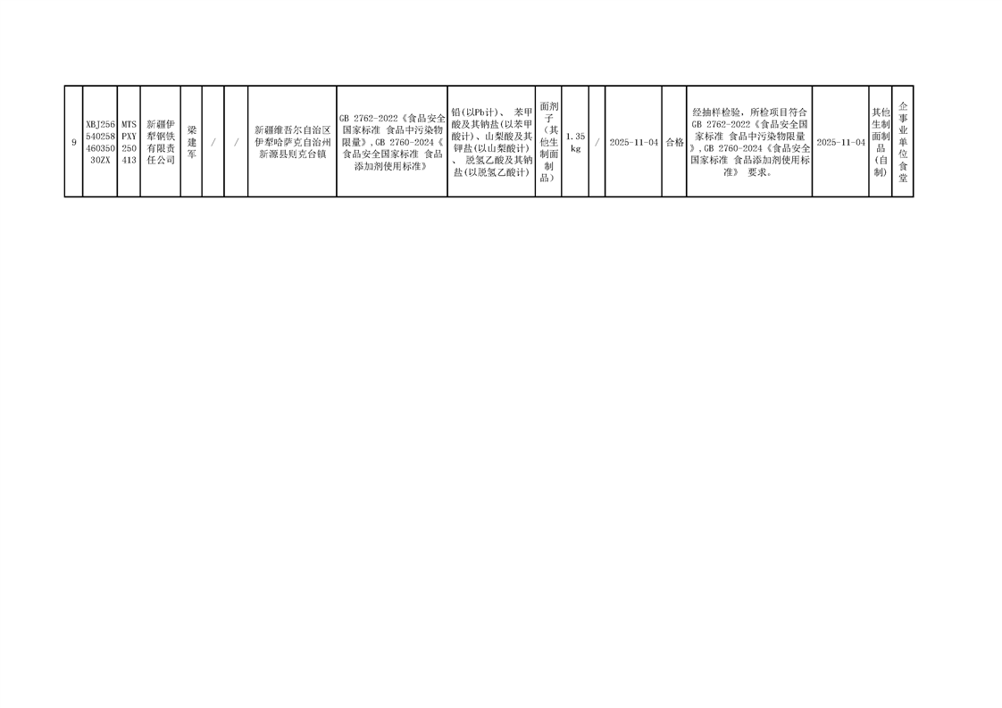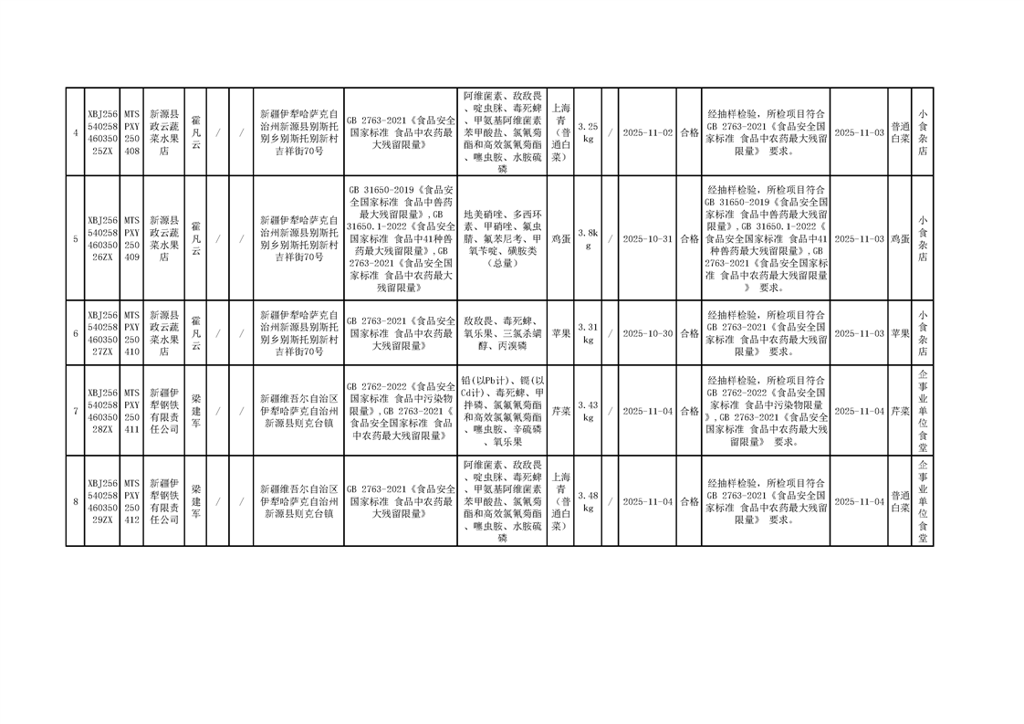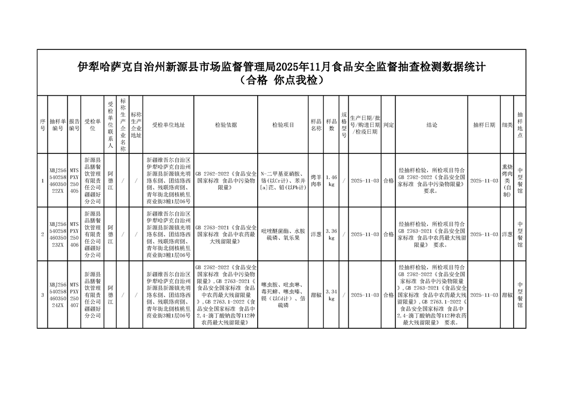伊犁哈薩克自治州新源縣市場監督管理局2025年11月食品安全監督抽查檢測數據統計(合格 你點我檢)