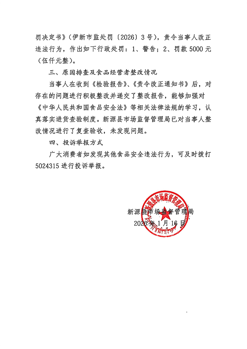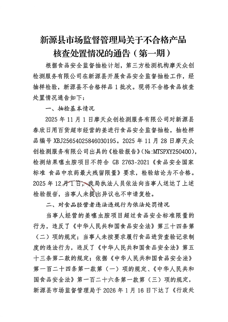 2026年新源縣市場監督管理局關于不合格產品核查處置情況的通告(第一期)