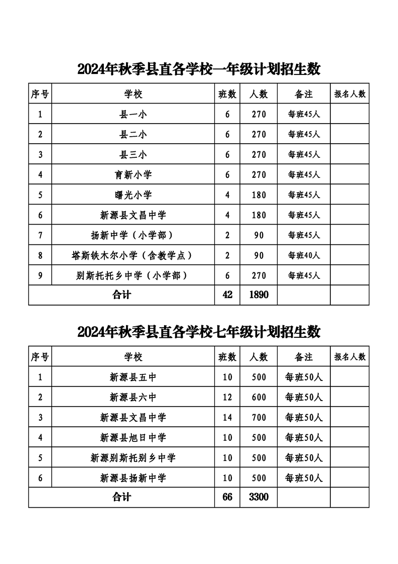 2024年秋季縣直各學校一年級、七年級計劃招生數