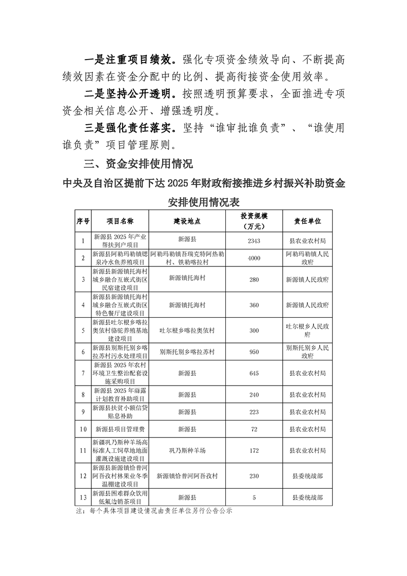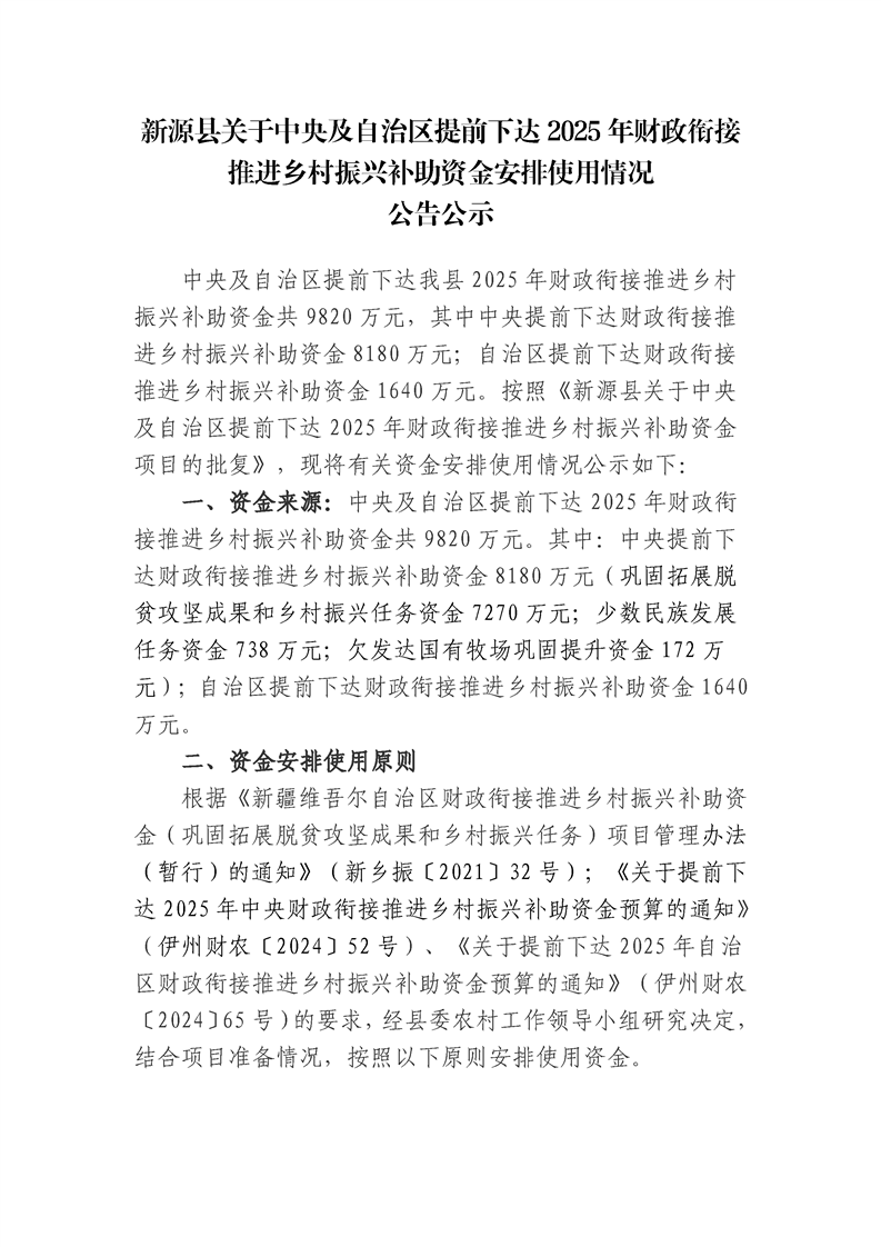 新源縣關(guān)于中央及自治區(qū)提前下達(dá)2025年財(cái)政銜接推進(jìn)鄉(xiāng)村振興補(bǔ)助資金安排使用情況