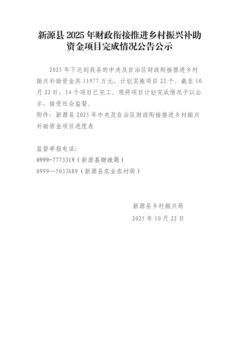 新源縣2025年財政銜接推進鄉村振興補助資金項目完成情況公告公示