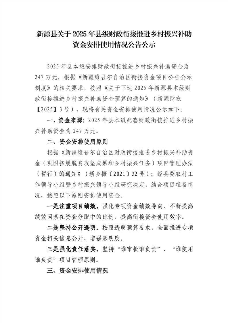 新源縣關于2025年縣級財政銜接推進鄉村振興補助資金安排使用情況公告公示