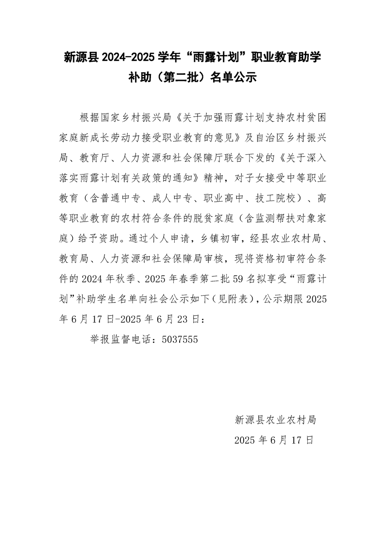新源縣2024-2025學(xué)年“雨露計(jì)劃”職業(yè)教育助學(xué)補(bǔ)助(第二批)名單公示