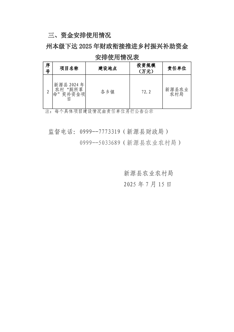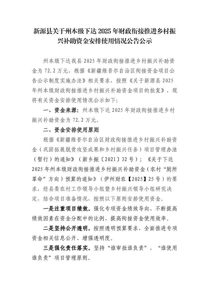 新源縣關于州本級下達2025年財政銜接推進鄉村振興補助資金安排使用情況公告公示
