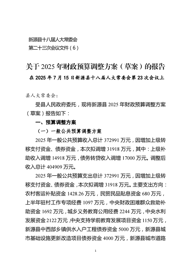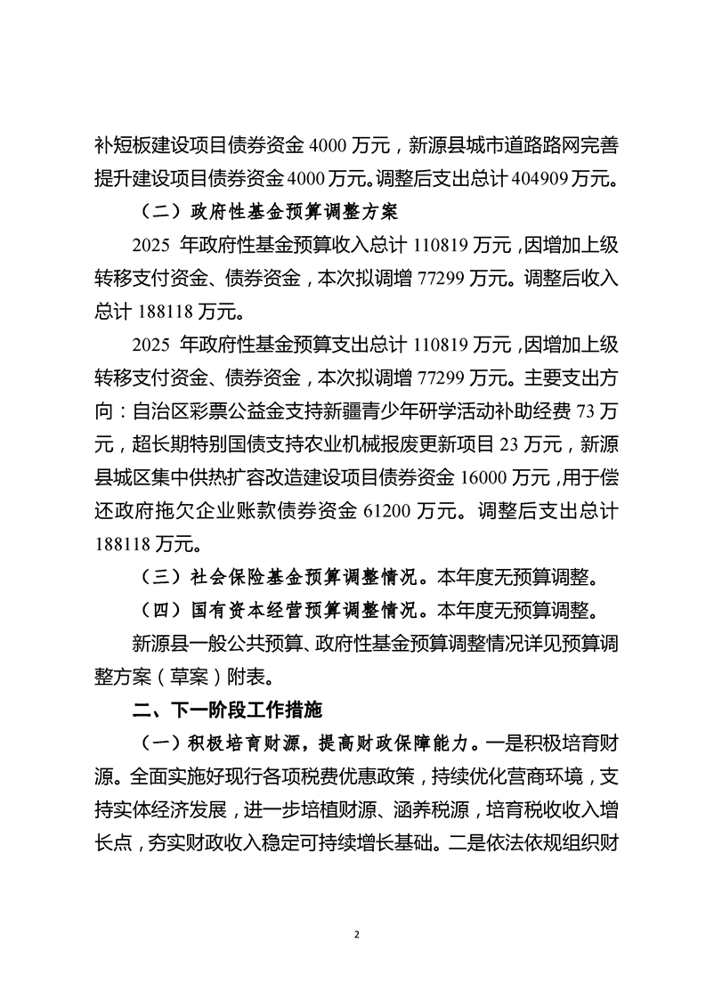 關于2025年新源縣預算調整方案(草案)的報告