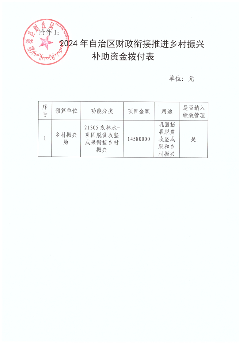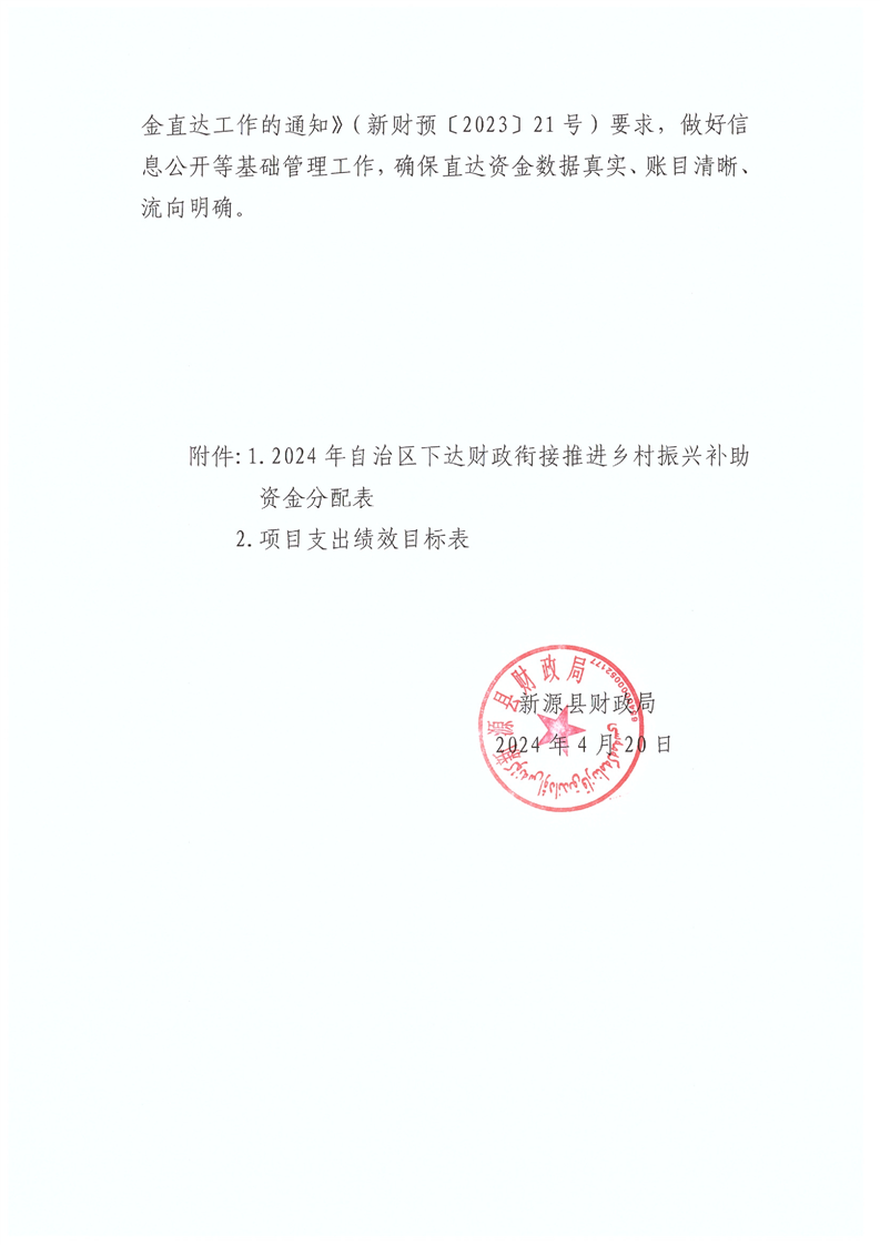 新源財農[2024]56號關于下達2024年自治區財政銜接推進鄉村振興補助資金[鞏固拓展脫貧攻堅成果和鄉村振興任務]預算的通知