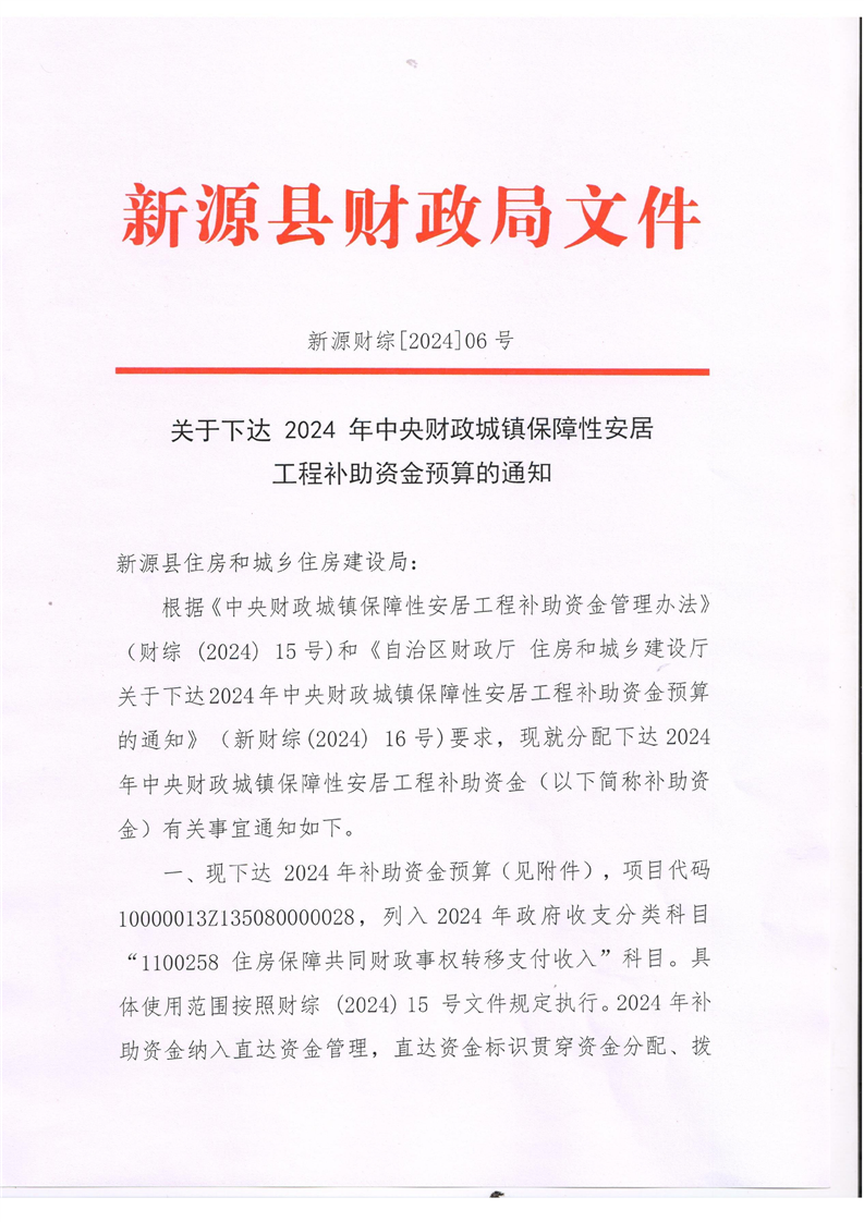 關于提前下達 2024 年中央財政城鎮保障性安居工程補助資金預算的通知
