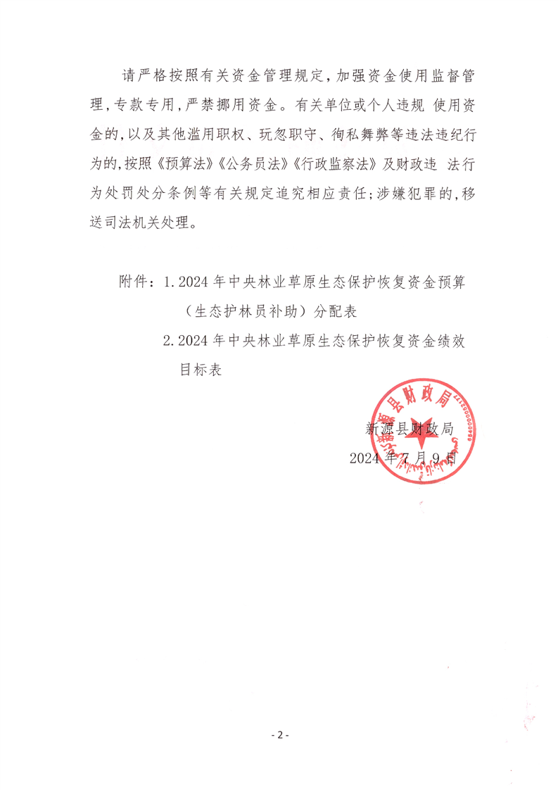 新源財建【2024】019號關于下達2024年中央林業草原生態保護恢復資金預算[第二批]的通知
