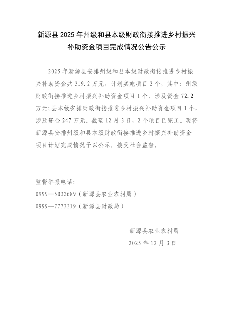 新源縣2025年州級和縣本級財政銜接推進鄉村振興補助資金項目完成情況公告公示