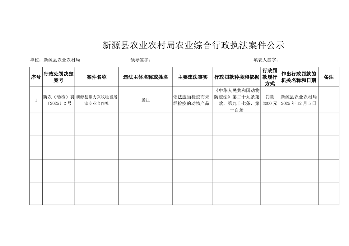 新源縣農業農村局農業綜合行政執法案件公示(依法應當檢疫而未經檢疫的動物產品)