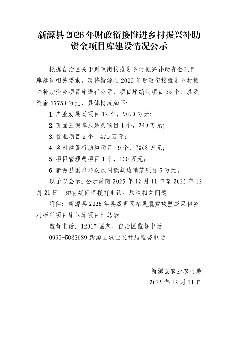新源縣2026年財政銜接推進鄉村振興補助資金項目庫建設情況公示