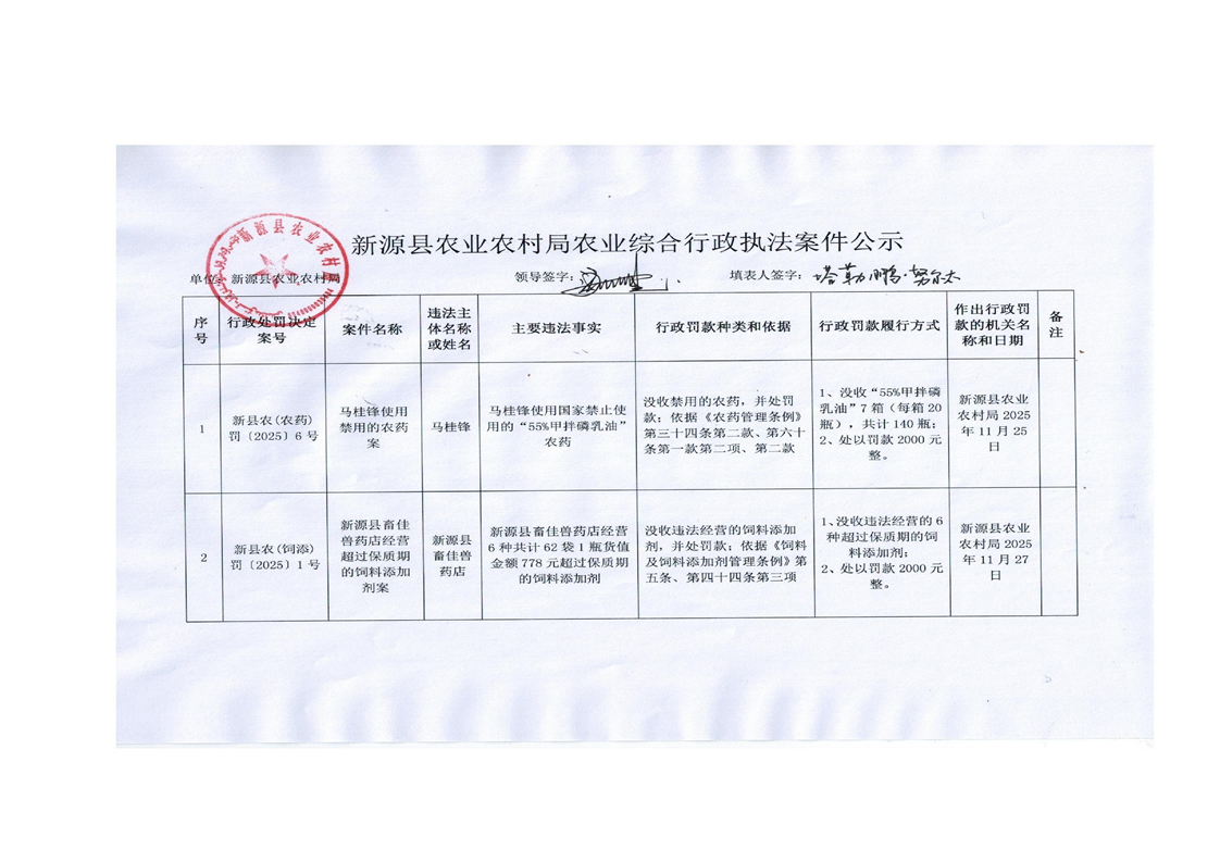 新源縣農業農村局農業綜合行政執法案件公示