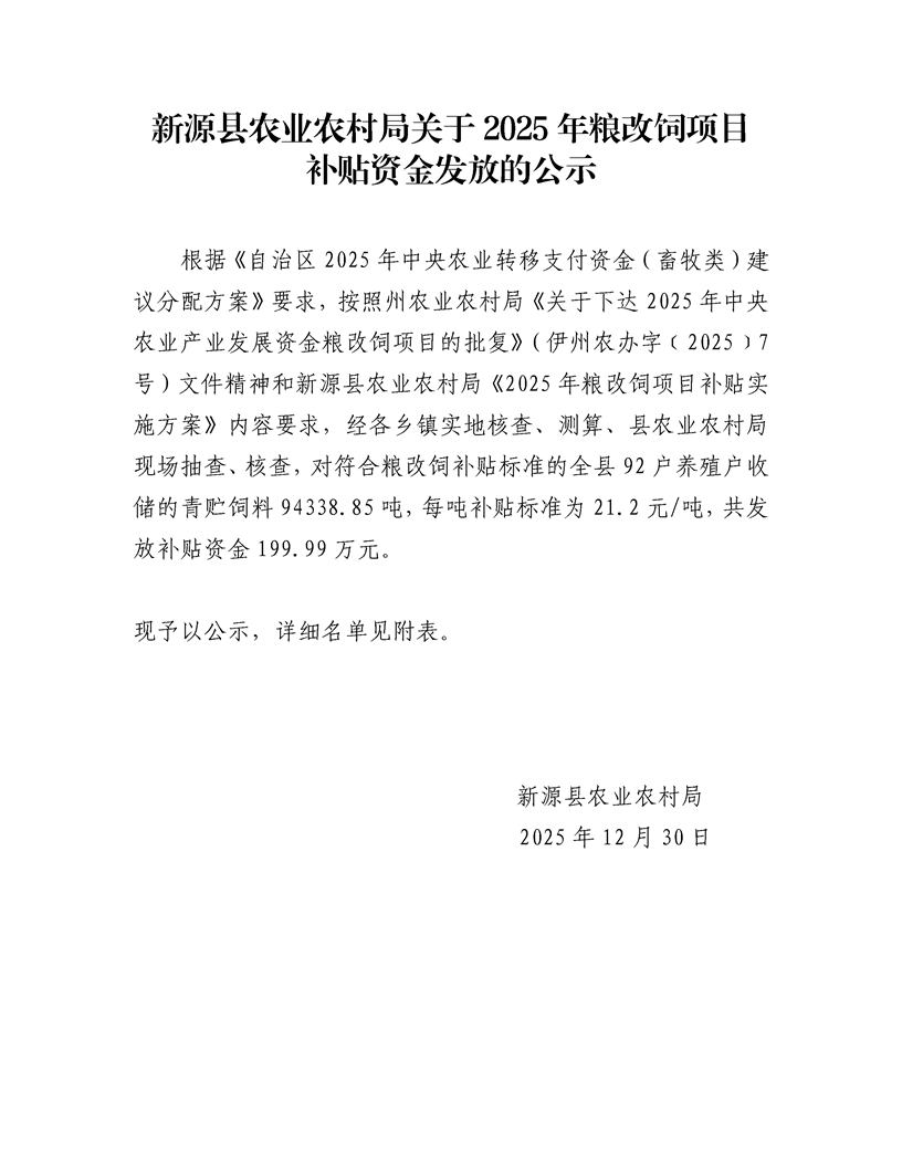 新源縣農業農村局關于2025年糧改飼項目補貼資金發放的公示