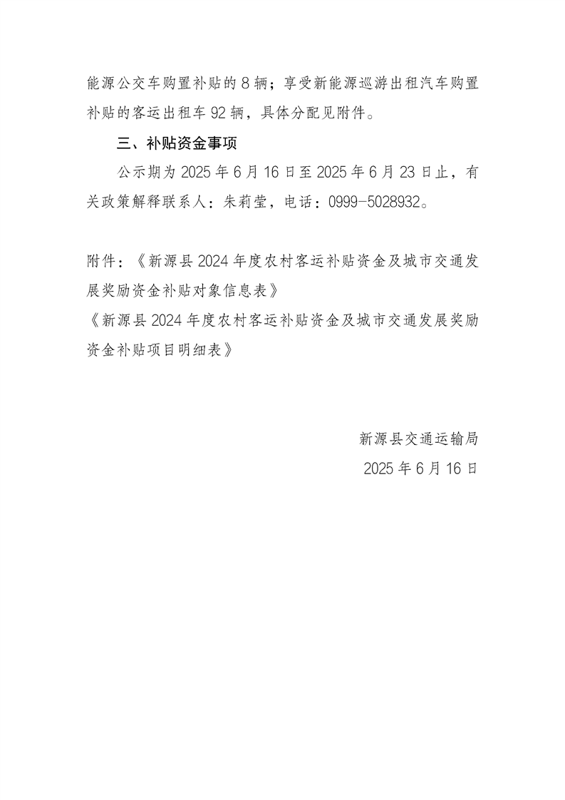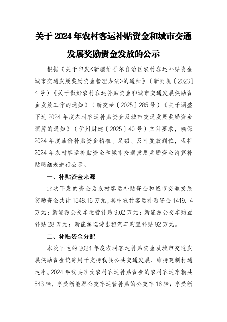 關于2024年農村客運補貼資金和城市交通發展獎勵資金發放的公示