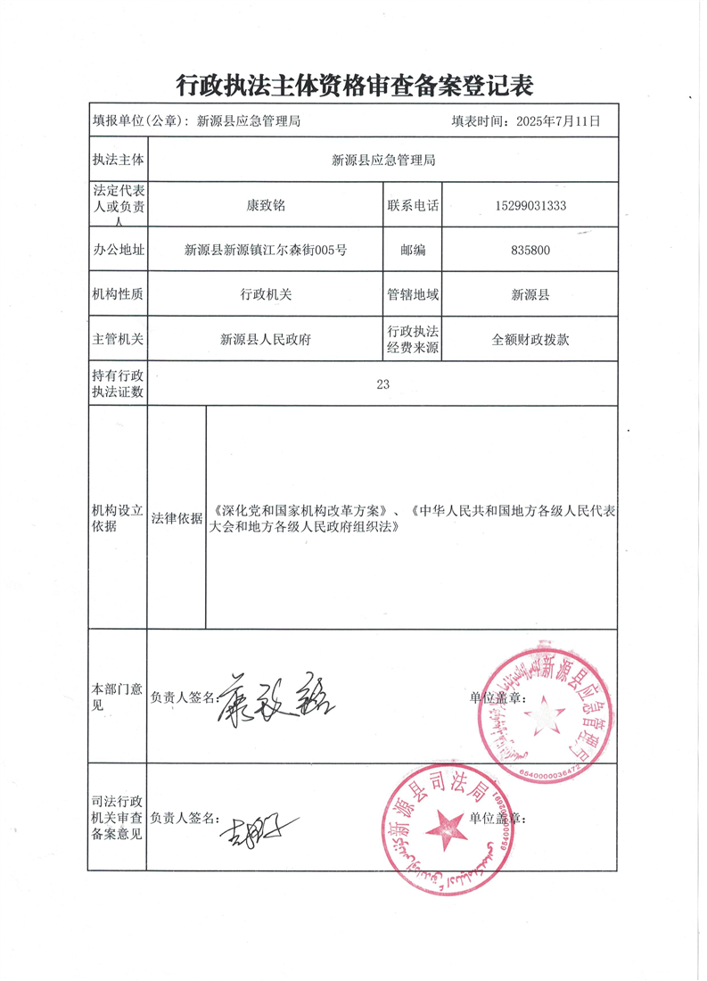 新源縣應急管理局行政執法主題資格審查備案登記表
