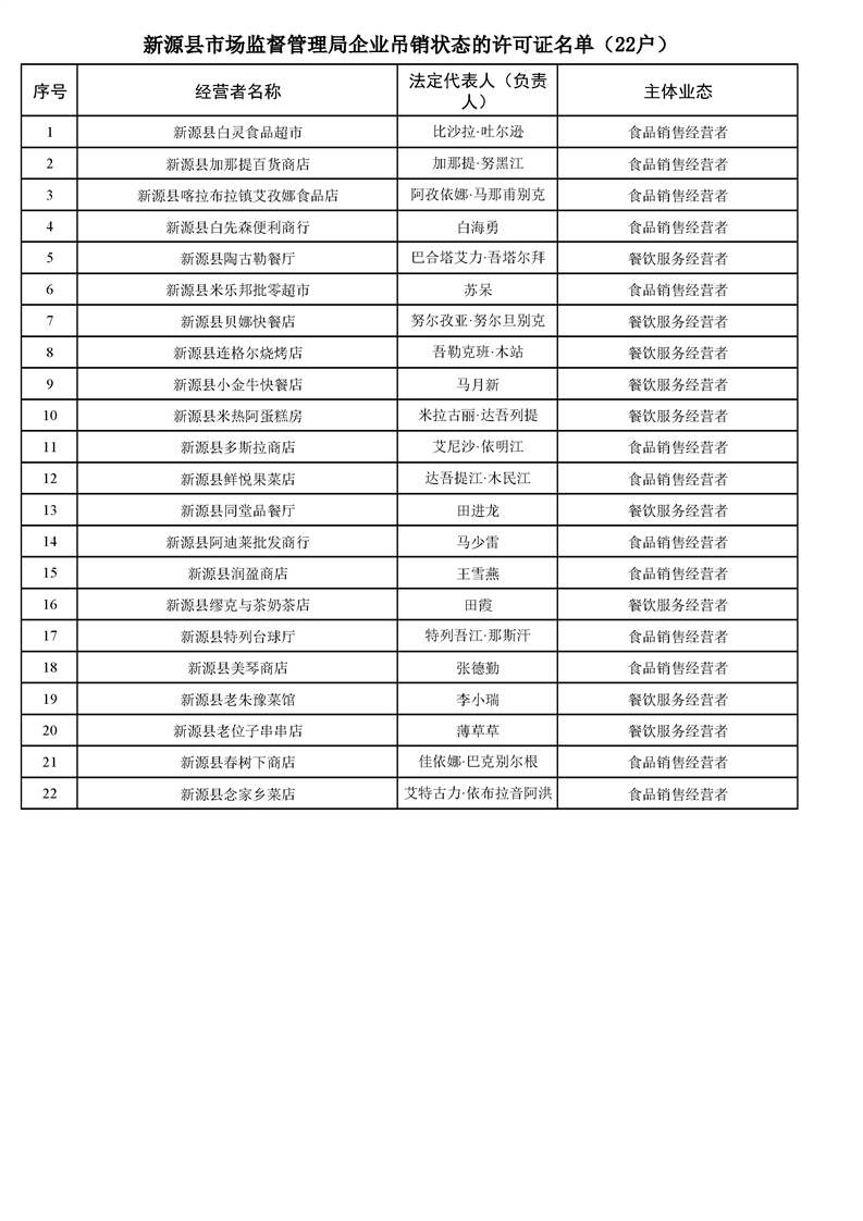 新源縣市場監督管理局企業吊銷狀態的許可證名單(22戶)