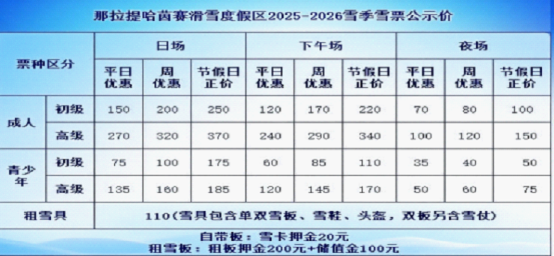 2025-2026雪季滑雪項(xiàng)目公示價(jià)
